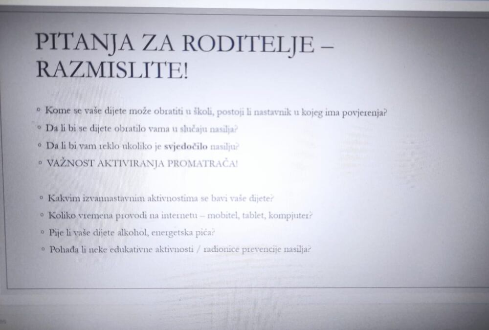 Naglasak predavanja bio je na osvještavanju roditeljske odgovornosti u prevenciji vršnjačkog nasilja te na konkretnim aktivnostima koje roditelji mogu poduzeti kako bi unaprijedili komunikaciju s vlastitim djetetom, ali i suradnju sa školom.