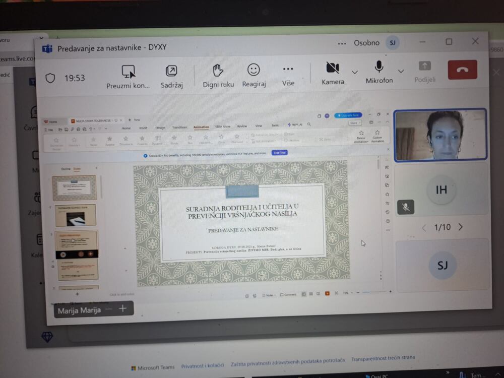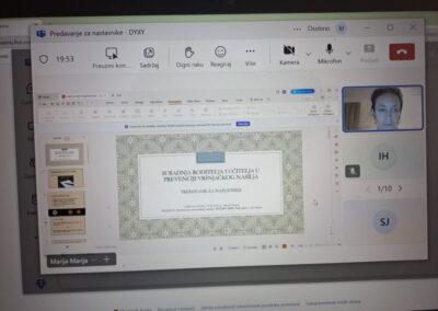 U organizaciji Udruge Dyxy, 29. kolovoza 2025. godine održano je online predavanje putem Zoom platforme za učitelje osnovnih škola pod nazivom „Suradnja roditelja i učitelja u prevenciji vršnjačkog nasilja“.