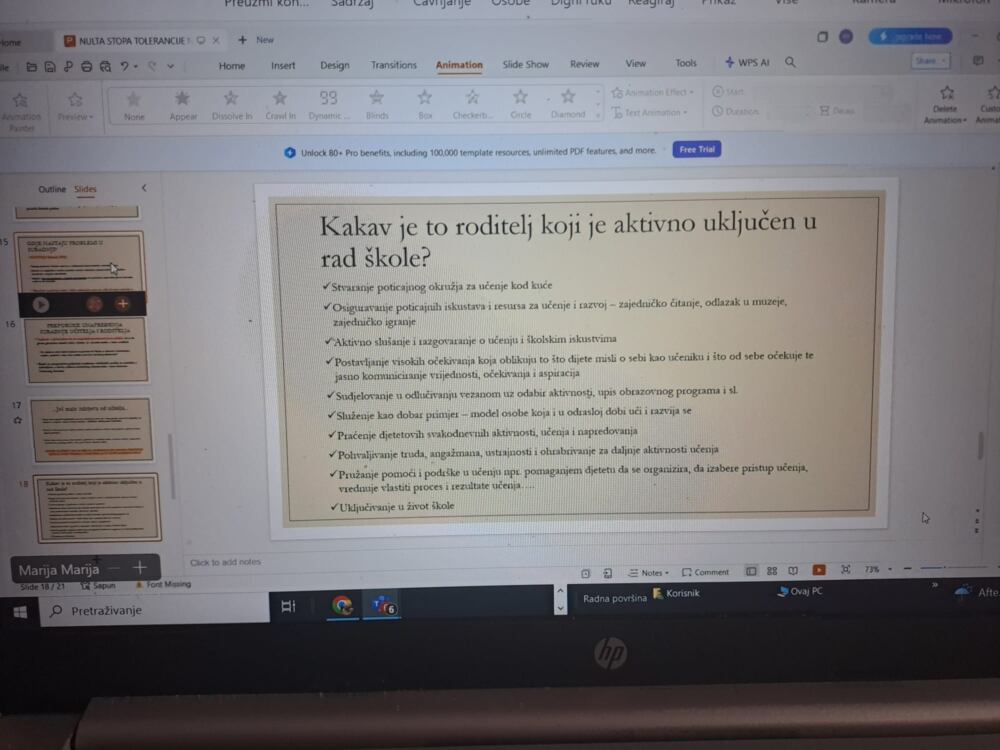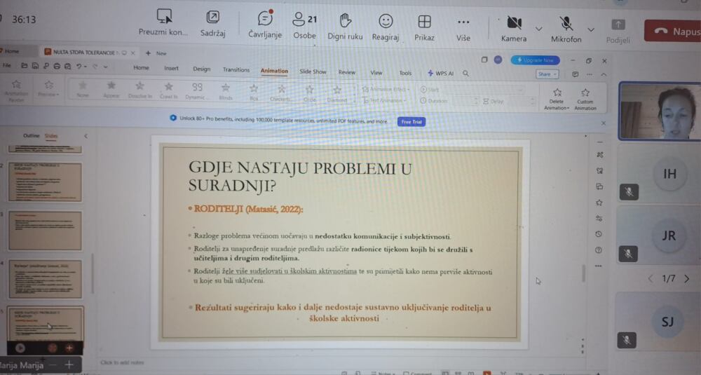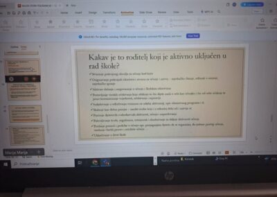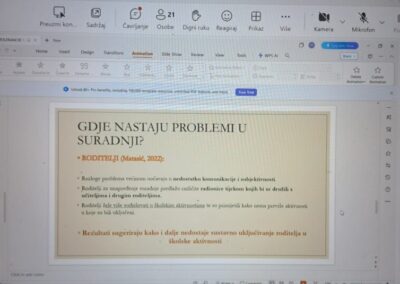 Tijekom predavanja istaknuta je važnost izgradnje međusobnog povjerenja i kontinuirane komunikacije između škole i obitelji. Sudionicima su ponuđeni konkretni koraci i alati za unapređenje suradnje s roditeljima, a kroz grupnu diskusiju razmijenjena su i osobna iskustva iz nastavne prakse.