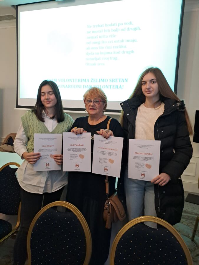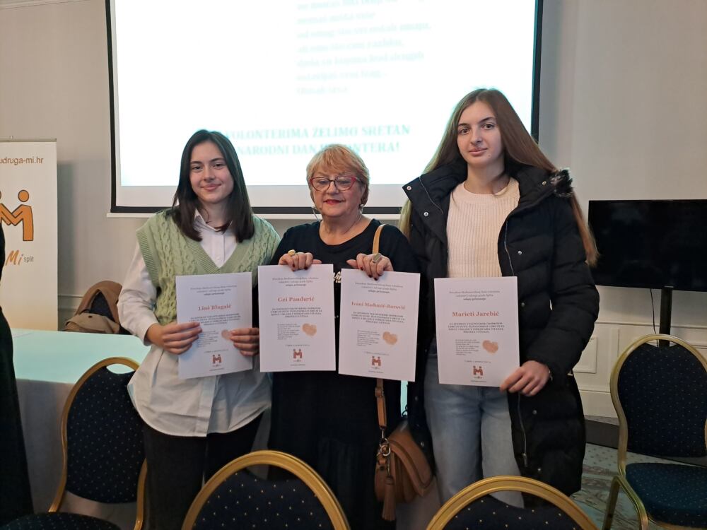 Naše četiri mlade volonterke dobile su priznanja i to: Lina Blagajić, Gea Pandurić, Marieta Jarebić i Jelena Borović Madunić, a zahvalnicu za podupiranje aktivnosti udruge Dyxy dobio je Luka Kovač Levantin.